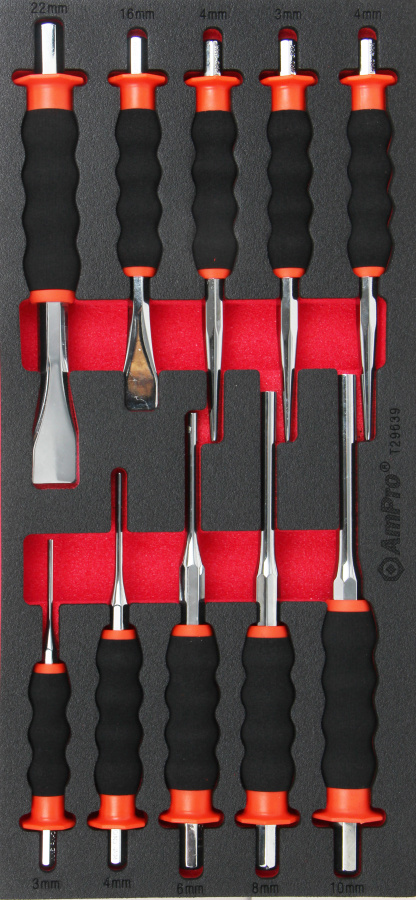 Приобрести T29639 Набор выколоток и зубил с защитными рукоятками 10пр., в мягком ложементе от компании AmPro (Тайвань) из раздела Ложементы мягкие (VA серия) по цене 4 279 рублей.