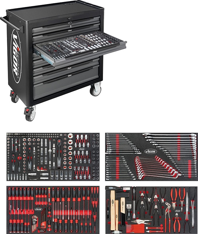Vigor Тележка инструментальная 1000XL 8 ящиков с комплектом инструментов 375 предметов.