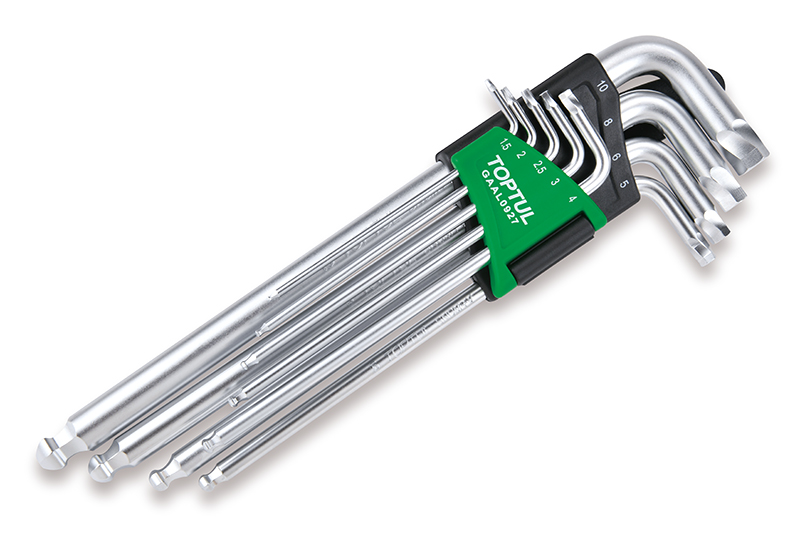 Приобрести Набор шестигранников Г-образных 1,5-10 мм, с экстрактором и шаром, экстрадлинные, 9 пр. TOPTUL от компании Toptul (Тайвань) из раздела Шестигранные Г-образные ключи по цене 2 719 рублей.