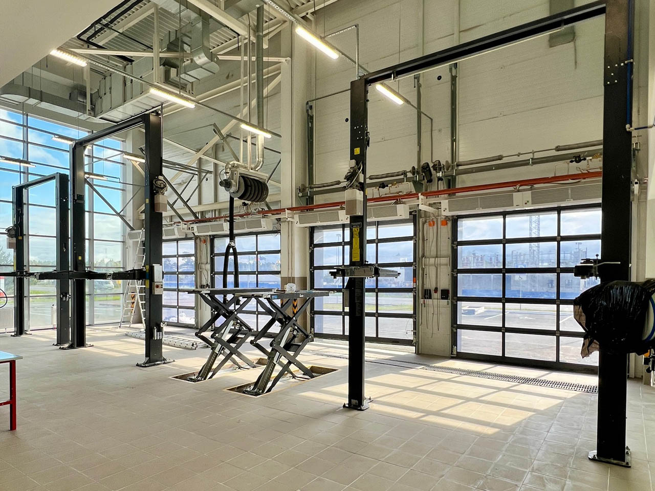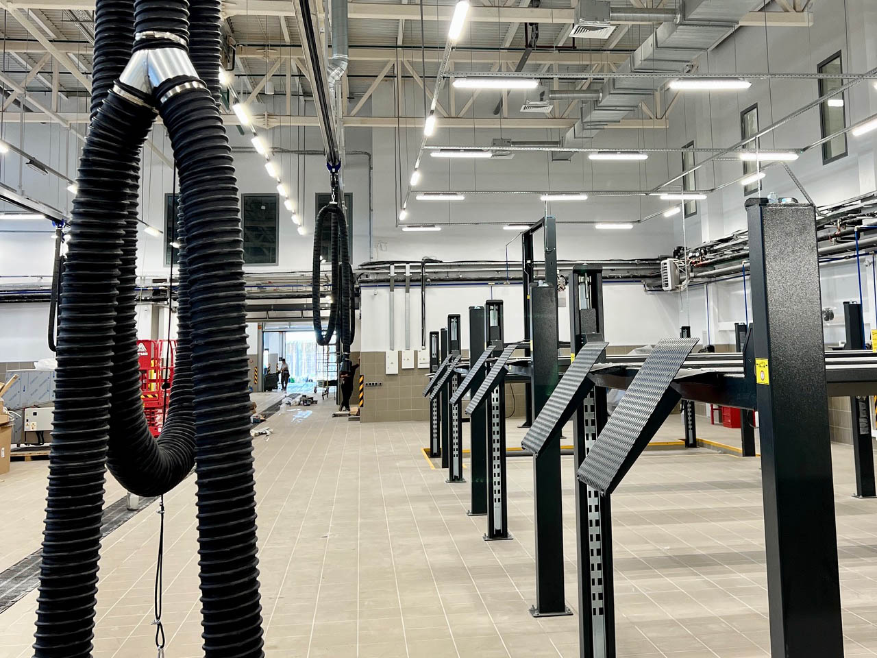 5. Поставлена и смонтирована подъемная складская платформа с высотой подъема, эквивалентной 3-му этажу, для эффективного использования складских площадей.6. Установлена современная система вытяжки отработанных газов, обеспечивающая безопасность персонала в зонах ремонта автомобилей.